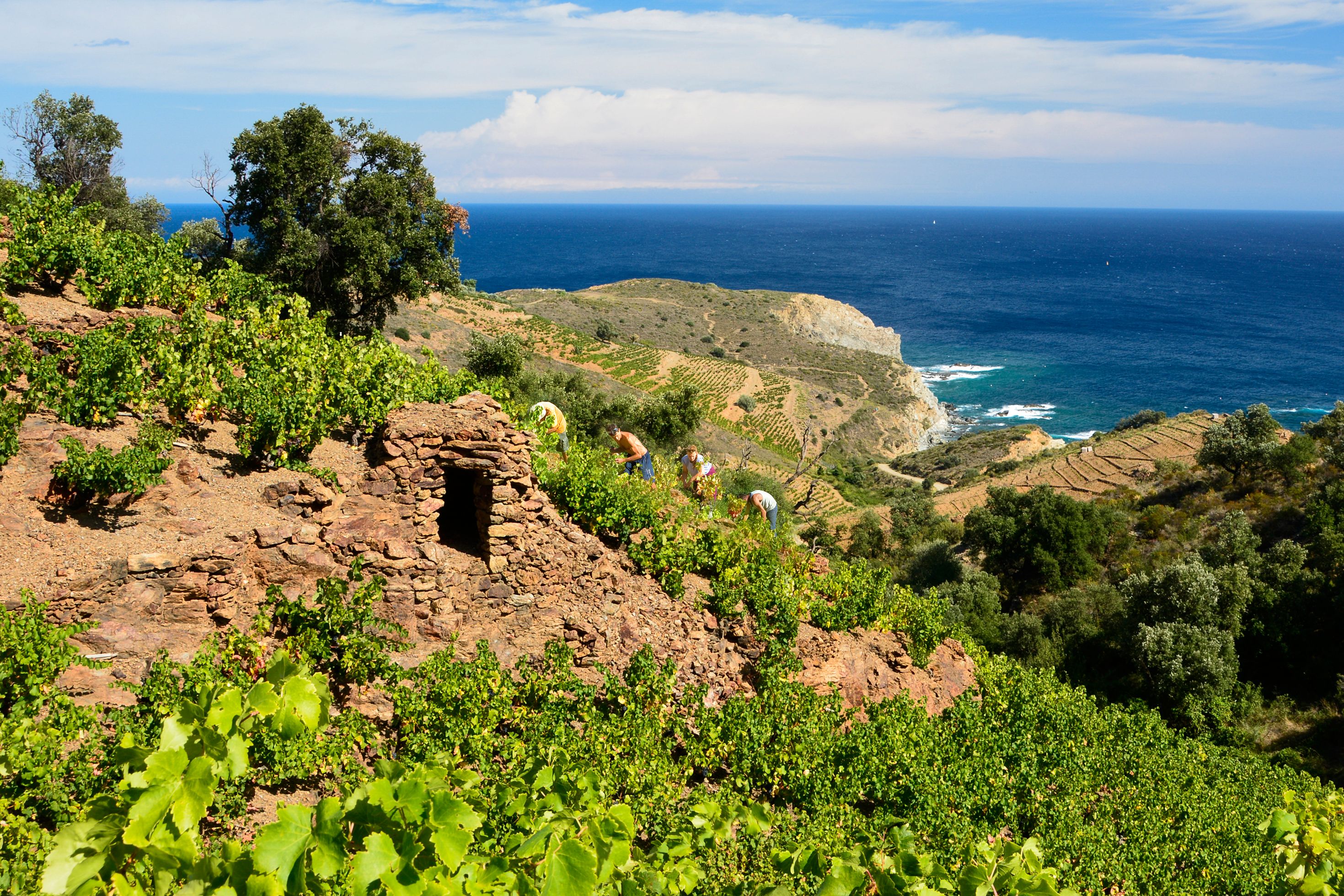Die Reben wachsen auf reinem Schieferboden, werden vom Tramontana-Wind unter der brennenden Sonne Südfrankreichs gepeitscht und haben ihr Geld verdient. Die steilen Hänge der Pyrenäenvorländer erfordern seit Jahrhunderten ausschließlich Handarbeit im Weinberg. Jeder Schritt der Weinbergpflege, vom Bau der niedrigen Mauern bis zur Ernte, wird von Hand und auf dem Rücken von Männern ausgeführt.